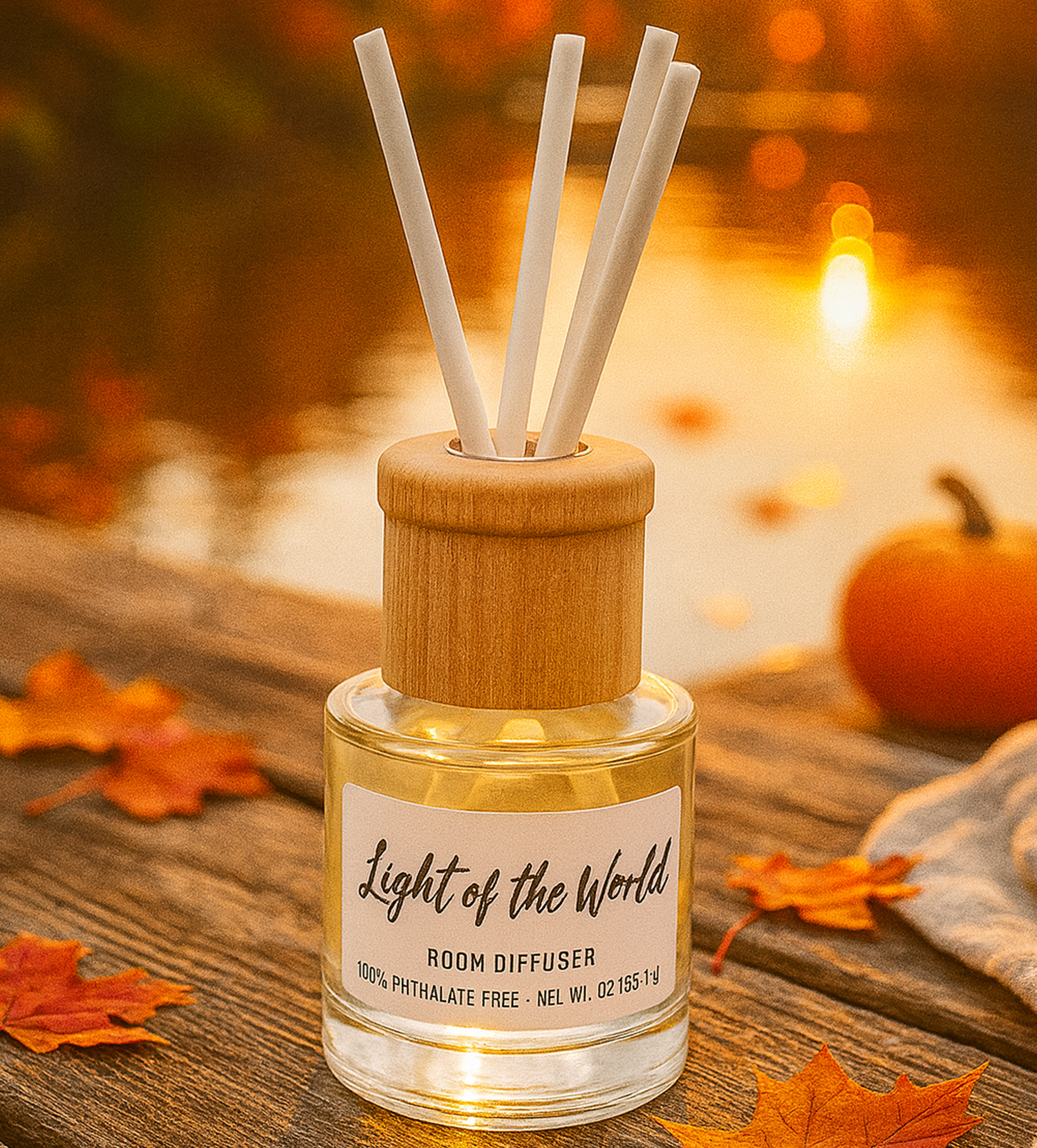 Shine with Light of the World – Citrus, Amber, and Teakwood. Inspired by John 8:12: “I am the light of the world… the light of life.”