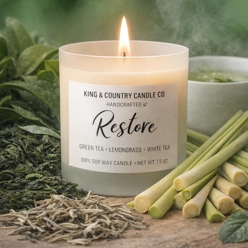 Restore is a breath of calm — clean, uplifting, and deeply soothing. Bright citrus and fresh lemongrass open the fragrance with a gentle clarity, while soft green tea and white tea create an airy, spa‑like heart. A delicate touch of jasmine and light musk settles quietly, leaving your space feeling refreshed, peaceful, and renewed.
