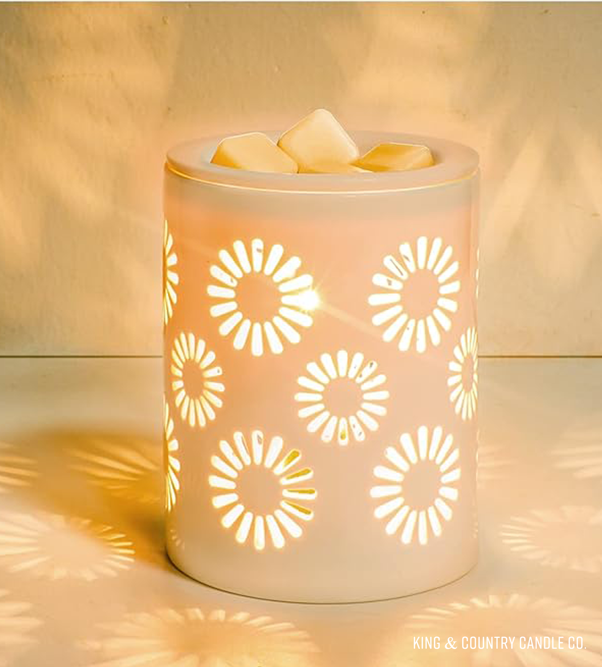 Brighten your home with this beautifully glazed ceramic wax warmer, designed with an elegant sunflower hollow-carved pattern. More than just a fragrance warmer, it doubles as a glowing piece of art that adds warmth and charm to any room.